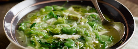 Add the chicken stock and bring to the boil. Add the broad beans, Savoy cabbage and smoked chicken and cook for a further 5 minutes