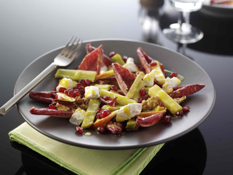 3. Once the leeks are cooked, remove them from the oven and cut into quarters, lengthways. Mix the leeks and endive leaves with the walnuts, sliced apples and pomegranate seeds. Dress lightly with half of the dressing and pile onto a big platter. Top with crumbled goats cheese and finish with the remaining dressing.