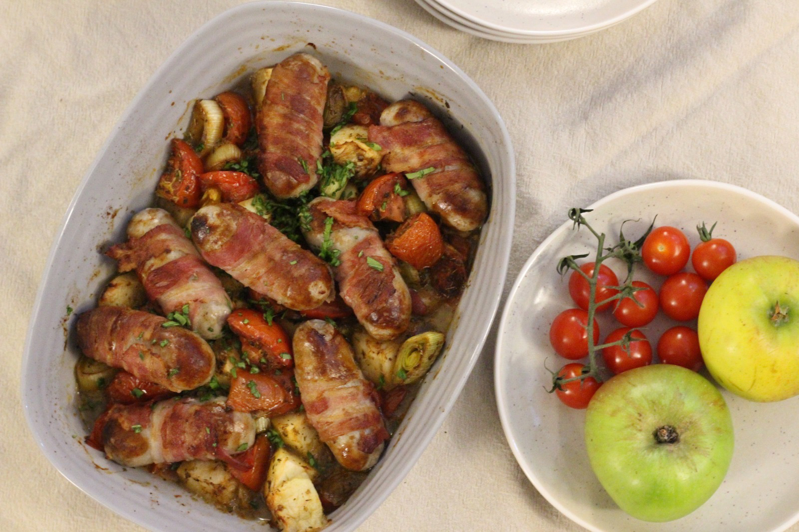 Cook at 190°C for 35 – 40 minutes or until sausages are cooked through and you can pierce apples easily with a knife.